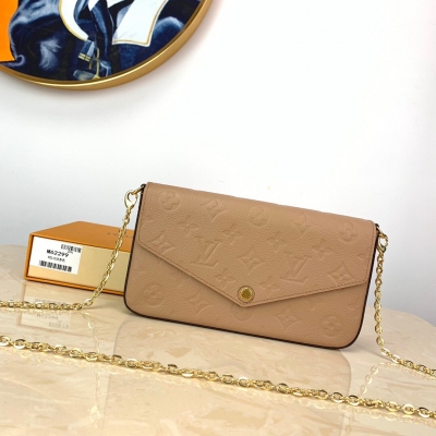LV LOUIS VUITTON 路易威登 M62299 杏色壓花!POCHETTE FÉLICIE 鏈條包 由Monogram Empreinte牛皮面料裁制而成的Pochette Félicie 鏈條包內含兩個可脫卸口袋,是攜帶整理您的日常用品的時尚之選。21.0 x 12.0 x 3.0 cm 。(長 x 高 x 寬) 。- 21 x 12 x 3 釐米- Monogram Empreinte牛皮- 天然牛皮飾邊- 超細纖維內襯- 閃亮金色金屬配件- 1個內貼袋- 1個大號隔層,2個可脫卸部件:拉鍊袋與貼袋,配有8個信用卡槽,可拆卸金色金屬包鏈,方便肩背或斜挎, 摁扣開合。