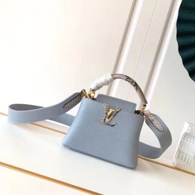LOUIS VUITTON LV路易威登 M96467 M95509Capucines 迷你手袋 天空藍高貴的牛皮,奢華的胎牛皮襯裡,閃亮的金屬飾件,特有的Capucines搭蓋既可收入包內展示字母標識,又可外翻 呈現Monogram Flower圖案 蛇紋size:21x14x8cm