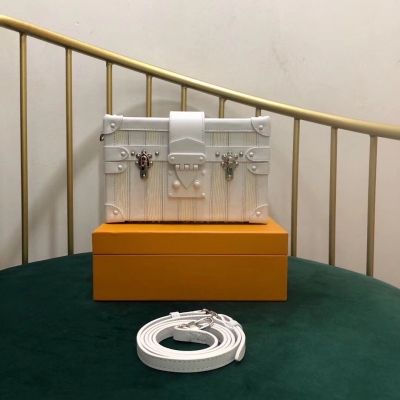 Louis Vuitton LV 路易威登 PETITE MALLE 盒子包 M44199純白水波紋 采經用典的Monogram帆面布料 靈感源自富的有銀行家Albert Kahn于20世紀初期設計的制定旅行箱 以3個白色字十圖案為標誌性要素 經典的優風雅格 適合間夜外出聚會使用的品精小號包袋 size 20x12.5x5cm