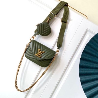 LOUIS VUITTON LV 路易威登 M56466 M56461 Multi Pochette New Wave手袋由柔滑的絎縫小牛皮構築而成,活力設計,可調節肩帶,做舊感的金屬飾件,古銅金色鏈條與路**登銘紋提花肩帶,提供斜挎等多種背攜方式,肩帶上的圓型零錢包可放鑰匙,零錢等。尺寸:21x13x6.5cm