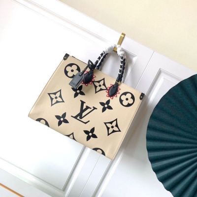 LOUIS VUITTON LV 路易威登 M45372 M45373本款 OnTheGo 大號手袋以壓紋皮革呈現經典 Monogram 圖案的醒目放大,再為頂部編織手柄下方點綴街頭風格元素。充裕空間及內袋可輕鬆收納日常所需。詳細特徵 41.0 x 34.0 x 19.0