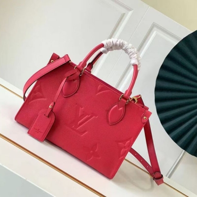 M45661 黑色 玫紅色迷你號 頂級原單 本款 OnTheGo Tote 包將 Monogram 圖案先印染後壓印於柔軟粒面牛皮,其充裕內裡可容納筆記型電腦及其他辦公用品,全皮壓大花媽咪袋小bb號,長短手柄便於手提或肩背。尺寸:28.0 x 11.0 x 19.0 釐米