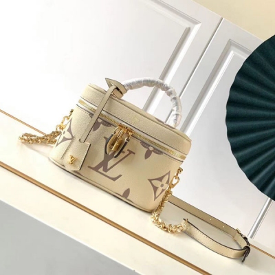LOUIS VUITTON LV路易威登 M45599 M45608本款 Vanity 小號手袋融合 Giant Monogram 壓紋、雅致構型和皮革頂部手柄。皮革抽穗輕鬆開啟拉鍊,掛鎖確保安全無虞。可拆卸並調節的肩帶配有皮革編織鏈條。尺寸19×13×11cm
