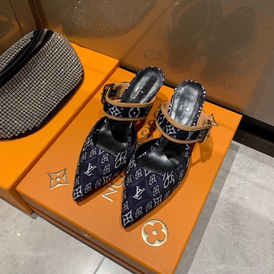 LOUIS VUITTON LV路易威登 2021夏日提花高跟拖鞋 今年牛仔風席捲而來,提花好看有質感,上腳顯瘦,舒適才是王道!超美品質,原版定制提花刺繡面料/牛皮,羊皮內裡,鞋底原版真皮大底,size: 35-39