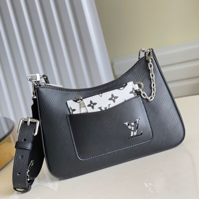 LOUIS VUITTON LV 路易威登 獨家實拍M80689黑 M45688 Marelle 手袋取材 Epi 粒面皮革,以鏈條固定外袋之中的可拆卸帆布拉鍊袋。系上頂部手柄或可調節肩帶,手持、肘挎、肩背和斜挎自如轉換。詳細特徵25 x 15 x 8 釐米 (長度 x 高 x 寬)