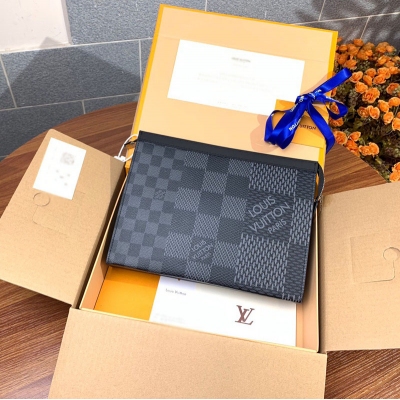 LOUIS VUITTON LV 路易威登 升級版本 N60444 POCHETTE VOYAGE 手拿包!本款 Pochette Voyage 手拿包選取 Damier Graphite 3D 帆布,展現路易威登經典格紋的當代演繹。大號隔層和卡位方便收納旅行檔及日常所需,可與旅行箱搭配使用,讓出行有條不紊。詳細特徵27 x 21 x 6 釐米 、(長度 x 高 x 寬)Damier Graphite 3D 塗層帆布、牛皮飾邊、織物內襯、金屬件、拉鍊封口、內貼袋、卡片夾層、本品產地為法國、西班牙、義大利和美國之一。