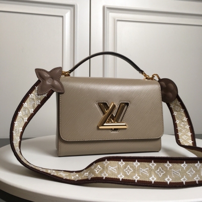 LOUIS VUITTON LV路易威登 M57050象灰色 頂級原單 本款 Twist 中號手袋取材 Epi 皮革,再令皮革 Monogram 花卉綻放於刺繡寬肩帶底部,後者兩側分別呈現迷你 Monogram 圖案和路易威登標識,搭配可拆卸頂部手柄。尺寸23x17x9.5cm