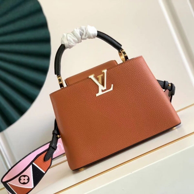 LOUIS VUITTON LV路易威登 M58610 M94755 BB 本款 Capucines BB 手袋取材 Taurillon 皮革,為寬幅肩帶一面刺繡路易威登標識,另一面借喀喇昆侖山脈之名,將 Monogram 花卉融入三角圖形中,勾勒延綿起伏的群山之景。每條肩帶的刺繡需數小時完成。尺寸:27*18*9cm 尺寸:31*21*11cm