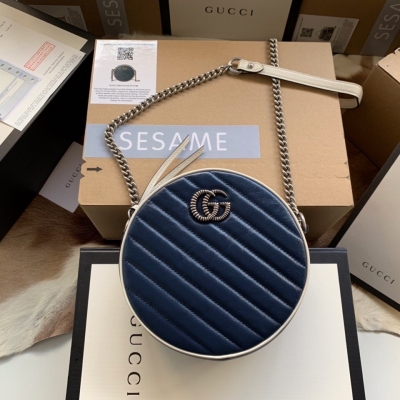 Gucci古馳 GG Marmont系列 藍配白原廠皮迷你圓形包 550154