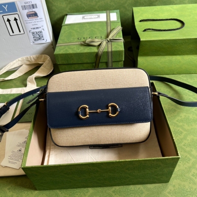 GUCCI古馳 馬銜扣1955系列 麻布藍皮小號斜挎包 645454