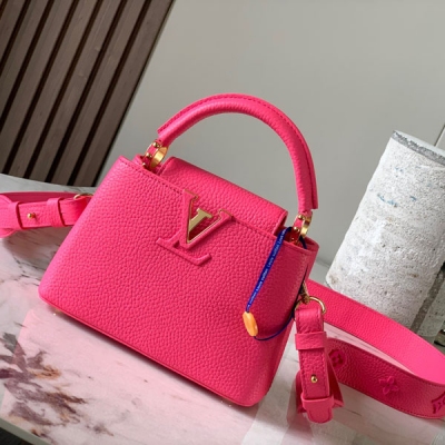 LOUIS VUITTON LV 路易威登 特級精品原廠皮M20848/M20849梅粉金扣 本款 Capucines 迷你手袋為粒面牛皮革浸染螢光色彩,再為寬幅皮革肩帶點綴 Monogram 花卉簇絨,後者通過對縫線尺寸的精細把控,呈現天鵝絨般的柔滑質感。詳細特徵 21 x 14 x 8 釐米(長度 x 高 x 寬) 27 x 18 x 9釐米(長度 x 高 x 寬)