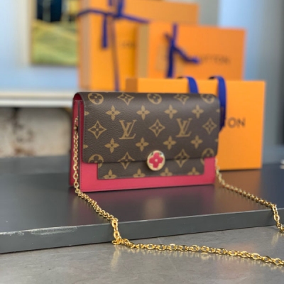 LOUIS VUITTON LV 路易威登 M67404 紫色!FLORE 鏈條錢夾!此款 Flore 鏈條錢夾以柔美輪廓拼接 Monogram 帆布和小牛皮,鑲綴獨具匠心的 Monogram 花卉形狀搭扣。內部空間充足,可容納手機和其他隨身物品,並可用作手拿包、單肩包或斜挎包。17.5x 11.5x 3.5 cm (長x 高x 寬)。