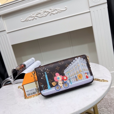 LOUIS VUITTON LV 路易威登 M81545三件套 此款 Félicie Pochette 手袋由 Monogram 帆布製成,以別致印花描繪品牌吉祥物 Vivienne 與加州小熊共乘敞篷車愜意暢遊好萊塢大道,沿途經過 LV 餐廳和茂密棕櫚樹之景。可拆卸口袋增添功能設計,手拿、肩背或斜挎皆宜。詳細特徵21 x 12 x 3 釐米。