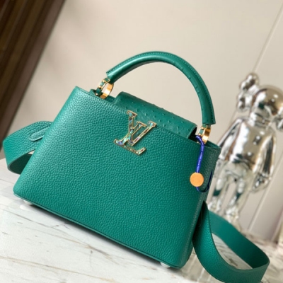 LOUIS VUITTON LV 路易威登 特級精品原廠皮 M21164/ N81409深綠配駝鳥貝殼扣 本款 Capucines 迷你手袋採用 Taurillon 皮革塑造玲瓏構型,以鴕鳥皮革包裹翻蓋、手柄和 LV 字母。翻蓋可外置或內收以 讀取 LV 標識,可拆卸寬幅皮革肩帶洋溢摩登風尚。 浸染明快色彩,將瑩潤貝殼嵌入 LV 字母。皮革手柄實現優雅手提,可拆卸寬幅肩帶增頃肩背和斜挎選擇。詳細特徵 21x14x8釐米(長度x高x寬) 27x18x9釐米(長度x高x寬)