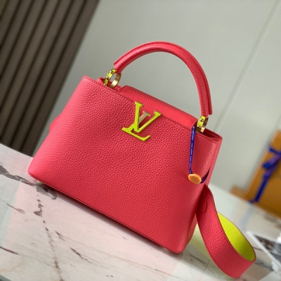 LOUIS VUITTON LV 路易威登 特級精品原廠皮 M59468桃紅配螢光綠金扣 本款 Capucines BB 手袋以全粒面牛皮革塑造 Capucines 系列的小巧尺寸,搭配 LV 字母、標誌性側環和 Monogram 花卉翻蓋。詳細特徵 27 x 18 x 9 釐米(長度 x 高 x 寬)