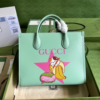GUCCI古馳 Bananya印花托特包,閃電香蕉印花Bananya印花在 古馳愛的進行曲 系列中貫穿出現,以彰顯充滿童趣的設計美學。這只神氣活現的貓咪因各種可愛的小惡作劇及與好友們的探險而聞名。這款淺綠色皮革托特包生動呈現了可愛的香蕉喵印花。淺綠色皮革Gucci和閃電Bananya BNF印花Bananya 棉麻襯裡,互扣式雙G橢圓形皮革標牌。型號:659983。尺寸:31(寬)x 26.5(高)x 14cm(深)顏色:綠色全皮/閃電印花。義大利創作 配全套原廠綠盒包裝