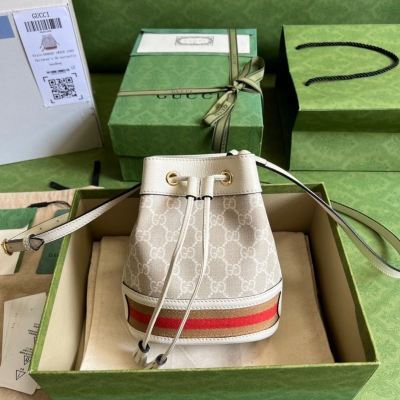 GUCCI古馳 Ophidia系列迷你GG水桶包。在 古馳愛的進行曲 全新時裝系列中,GG Supreme帆布推出了經典雋永的米白色和米膠組合,傳承材質的歷史淵源。對於環境的影響較低的帆布材質被長久地運用於多個系列當中,已成為品牌的標誌性材質。這款Ophidia系列迷你水桶包採用經典配色,並結合杏色和紅棕織帶設計項目。型號:550620。尺寸:15*18*9.5cm。顏色:米膠/米白色皮。配全套原廠綠盒包裝