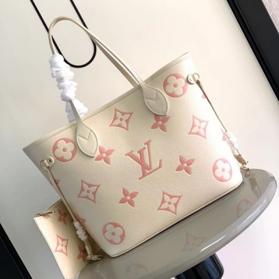 LOUIS VUITTON Neverfull 奶白色全皮壓花中號購物袋 M45686