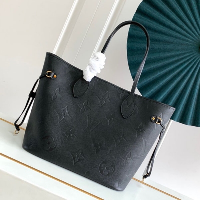 LV路易威登 Neverfull 全皮壓花黑色中號購物袋 M45686