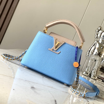 LOUIS VUITTON LV 路易威登 特級精品原廠皮 M59709/M59653/M59516 天藍配灰紫金扣 本款 Capucines 迷你手袋取材明亮 Taurillon 皮革,將皮革與鏈條交織纏繞,盡展匠心工藝。鏈條可隨心取下或調節,實現肩背和斜挎選擇。翻蓋內收即可呈現半包覆皮革的 LV 字母。21x14x8cm/27x18x9cm/31.5x20x11cm(長度x高x寬)
