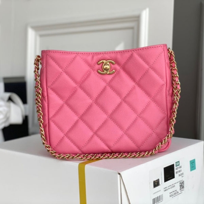 CHANEL香奈兒 2022P 桃紅小牛皮字母鏈條hobo嬉皮包 AS3259
