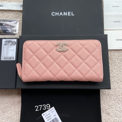 CHANEL香奈兒 19系列粉色細球紋鑲鑽拉鍊皮夾 AP2739