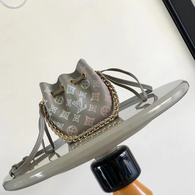 LOUIS VUITTON LV 路易威登 M82731 灰色/漸變(鏤空) 取材品牌標誌性鏤花牛皮革,以精緻穿孔描摹 Ays Monogram 花卉和 LV 字母。內斂色調與金屬件展露華美氣息,皮革抽繩確保個人物品安全隨行。尺寸:10.5 x 13.0 x 11.0 釐米