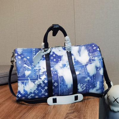LOUIS VUITTON LV 路易威登 M20558 KEEPALL BANDOULIÈRE 50 藍色Monogram Bandana圖案以獨特的漂染效果呈現,為這款以柔軟皮革及經典線條製作的Keepall Bandoulière 50軟身旅行袋帶來雅緻休閒的氣息。這款機艙行李尺寸的旅行袋內部間隔寬敞,可裝載週末出遊的必需品。旅行袋配有皮革頂端手柄和可拆式肩帶,可作多種方式攜帶。size:50*29*23