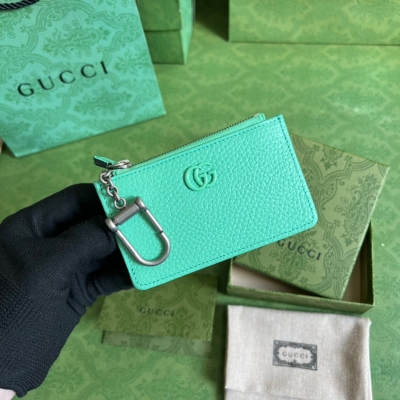 GUCCI古馳 GG Marmont系列鑰匙扣卡包,這款拉鍊卡包採用薄荷綠皮革。 古馳愛的進行曲 系列煥新呈現多功能元素,以此詮釋品牌崇尚的自我表達精神。這款單品配有3個卡片隔層和1個鑰匙扣掛鉤,綴飾具有辨識度的同色調雙G字母交織圖案配件,散發強烈的品牌標識內涵。薄荷綠皮革、薄荷綠樹脂配件,雲紋織物襯裡,雙G,背面有3個卡片隔層,外部:鑰匙扣掛鉤,拉鍊開合。型號:701070。尺寸:12.5(寬)x 7(高)x 1.5cm(深)顏色:薄荷綠/全皮。義大利創作 配全套原廠綠盒包裝