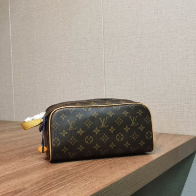 LOUIS VUITTON LV 路易威登 高版新款 M46696 該多普包化妝包是由會標望加錫塗層帆布與牛皮裝飾和可水洗紡織面料。橙色皮革的暗示,尤其是手柄,帶來了一抹現代感。堅固的雙拉鍊開口和手柄,可以用來掛在浴室掛鉤,使其實用。28x15x16.5釐米(長x高x寬)