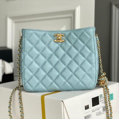 CHANEL香奈兒 晶片版 核桃金球hobo藍色羊皮腋下包 AS3259