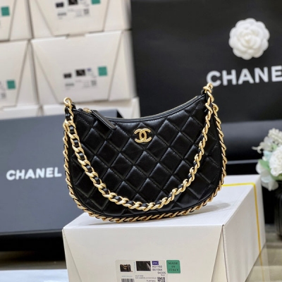 CHANEL香奈兒 黑色亮面小羊皮hobo女士腋下包 AS4378